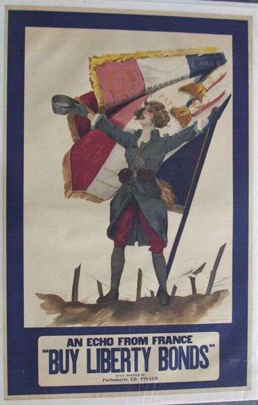 A young woman wearing a French uniform holds the French flag. Evidently a French poster reissued for an American audience.