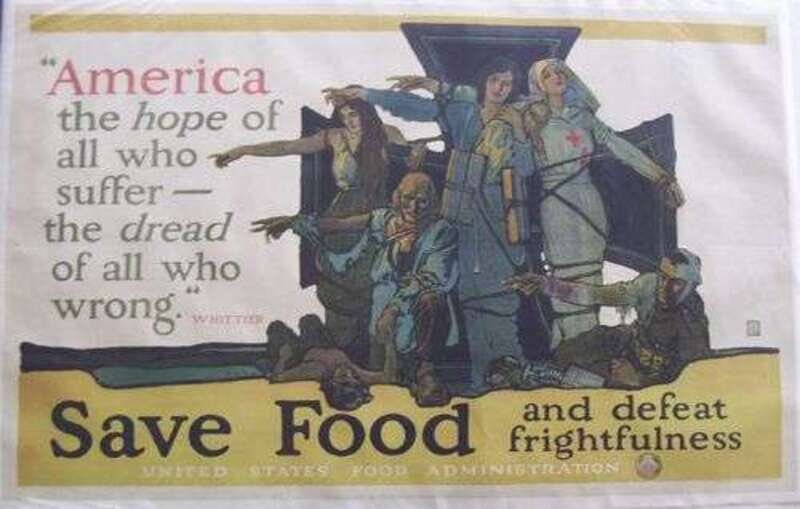 World War One Poster - American. Paus, Herbert. "America is the Hope of All Who Suffer..." Cincinnati & New York: The Strobridge Litho Co., ca. 1918. Color litho, 35 1/2 x 56 1/2 inches; 601 x 1435 mm. Condition B+; some light creasing along lower edge, minor chipping, expert repairs. Linen-backed.