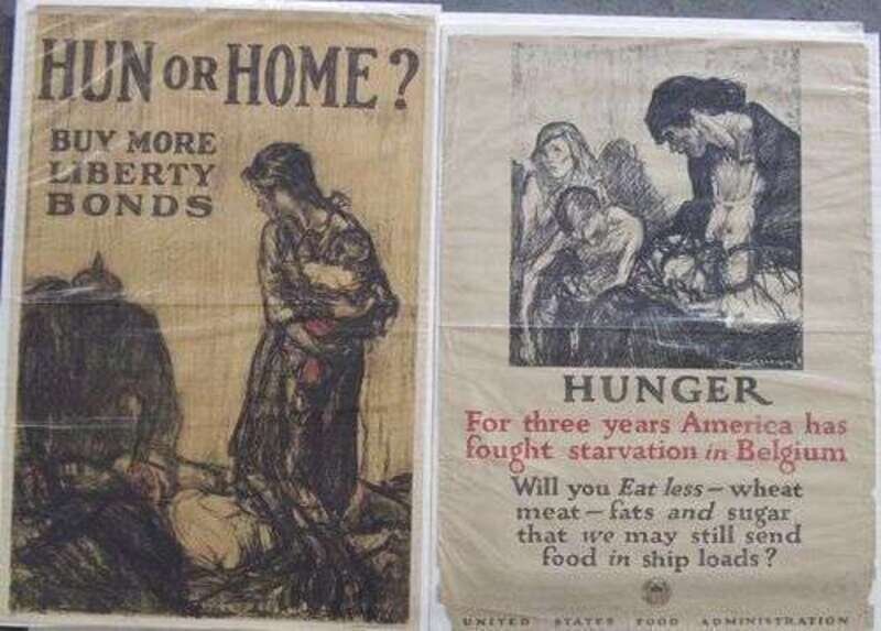 World War One Posters - American. Raleigh, Henry: "Hun or Home?" Chicago: Edwards & Deutsch, ca. 1918. Color litho, 30 x 20 inches; 762 x 508 mm. Condition B; some creasing & close tears to margins. Image of a woman with child running away from a German soldier. * "Hunger." United States Food Administration, ca. 1917. Litho, 29 1/2 x 21 inches; 749 x 533 mm. Condition B-; tears & creasing, some wrinkling to edges, lower edges chipped. Image of a group of starving women & children.