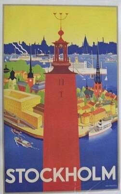 Travel Posters: Donner, Iwar. "Stockholm." Stockholm, 1936. Color lith, 39 x 24 inches; 990 x 609 mm. Condition B+; some creasing. Linen-backed. View of the port and city of Stockholm, Sweden. * Wilmink, M. "For Leisure, Health and Peace, 'tis only Holland that can Please." Delft: N.V. C.J. Van Doorne, n.d. [ca. 1930]. Color litho, 39 x 24 1/2 inches; 990 x 622 mm. Condition A-; some light wear along edges. Linen-backed. A sailboat on a canal, with windmill in background.
