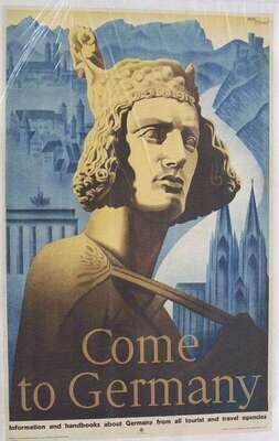 Travel Posters - German: Dzubas. "Germany." Berlin: Otto Elsner, n.d. [ca. 1930]. Color screen, 28 3/4 x 19 1/2 inches, 730 x 495 mm. Condition A-; some light creasing along edges, linen-backed. Image of motorcars & architecture in Berlin. * Eschle, Max. "Come to Germany." Berlin, n.d. [ca. 1930]. Color screen, 39 1/2 x 25 inches; 1003 x 635 mm. Condition A; some very light creasing & wear along edges. Linen-backed. Image of a statue, church, castle, Brandenburg gate. * Nix. "The Land of Art. Germany." Berlin, n.d. [ca. 1930]. Color screen, 39 1/2 x 25 1/4 inches; 1003 x 641 mm. Condition A; some light wear. Linen-backed. Image of a woodcarving of an angel playing a lute.