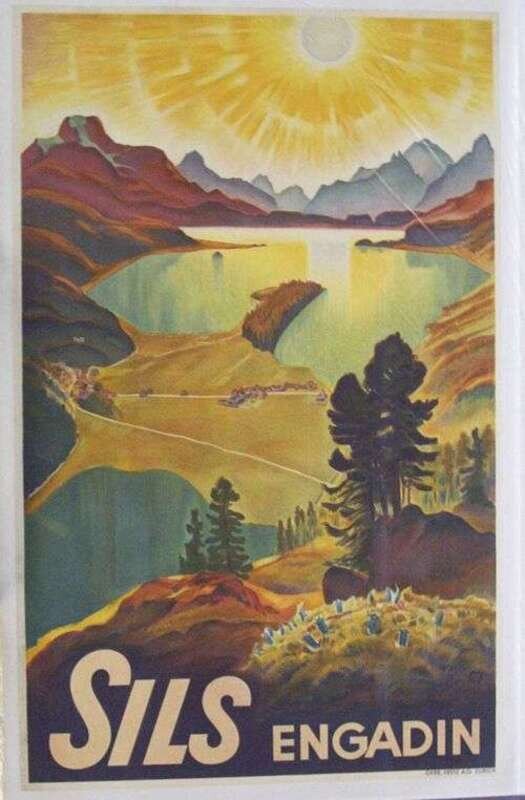 Travel Posters - Swiss: "The Electric Simplon Line." Zurich: Fretz Bros, n.d. [ca. 1930]. Color litho, 40 x 25 inches; 1016 x 635 mm. Condition B; some chipping along edges (repaired). Linen-backed. Image of a colorful village in the Swiss Alps. * "Sils Engadin." Zurich: Fretz, n.d. [ca. 1930]. Color litho, 39 1/2 x 25 inches; 1016 x 635 mm. Condition B-; some wear along edges. Linen-backed. Colorful view of a village by a lake.