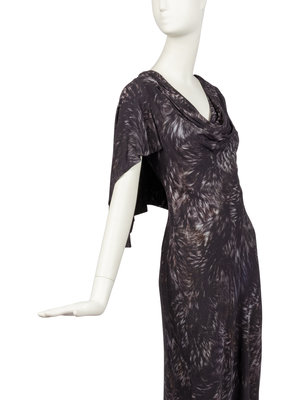 Grey printed viscose dress with draped neckline and sleeve cape, invisble zipper down the left side seam.