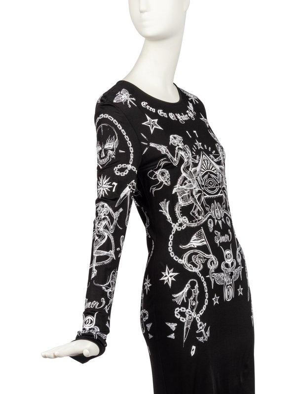 Black crewneck dress with long set-in-sleeves with printed skeletal design throughout.