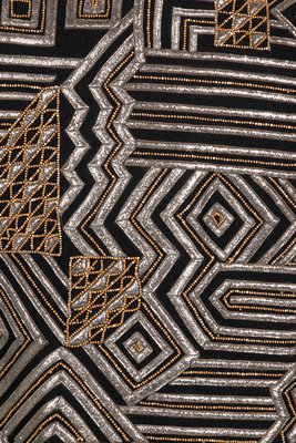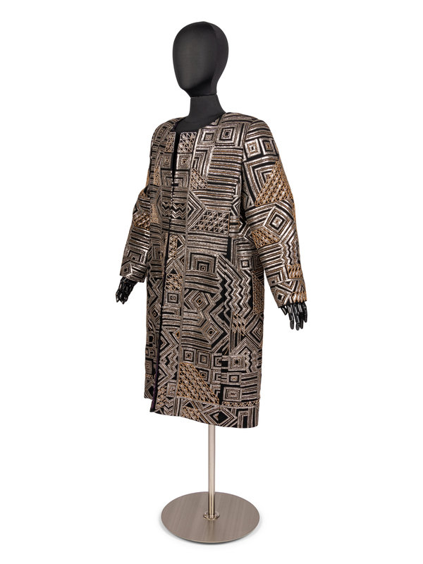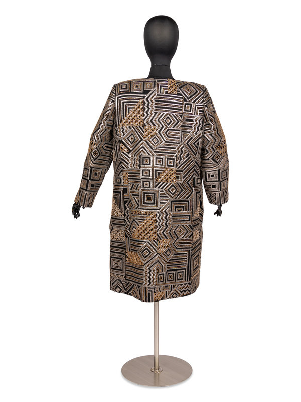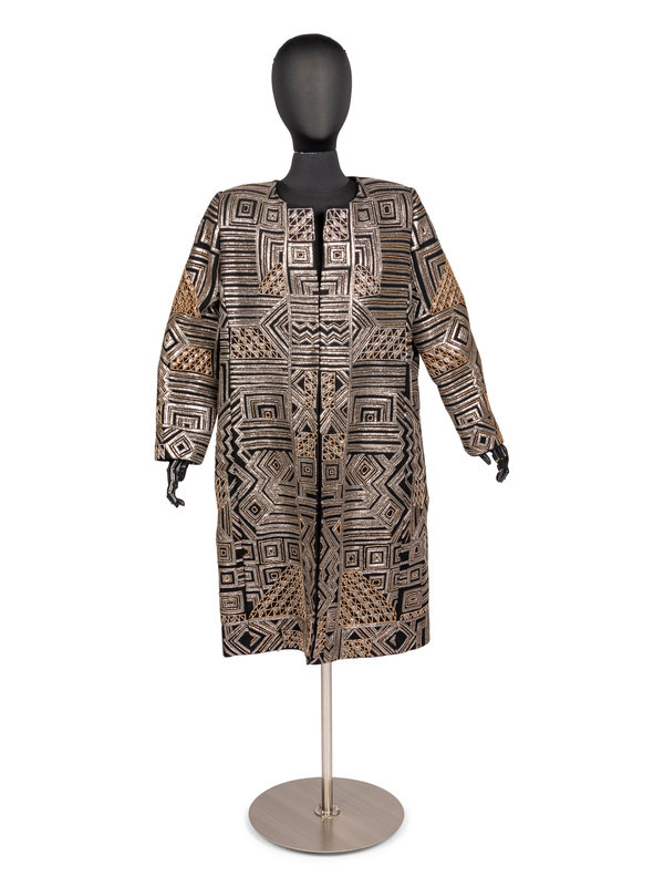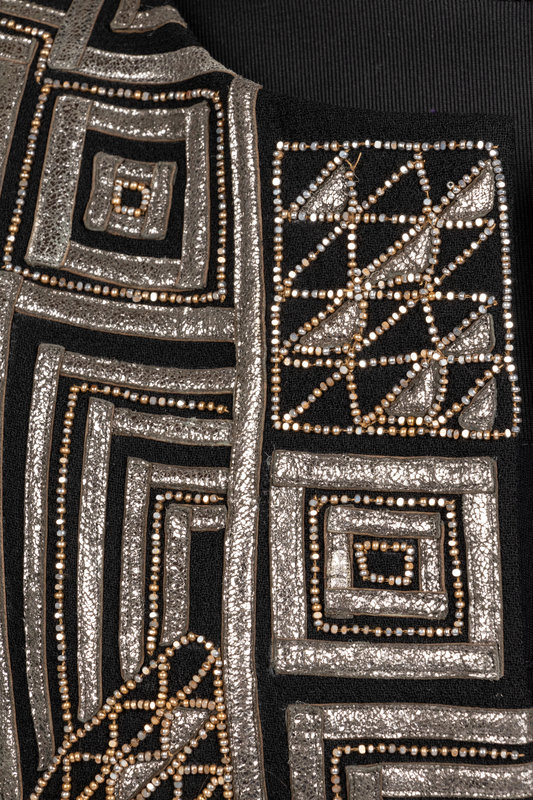 Black 100% wool open front long jacket with long set-in-sleeves and all over bronze-tone metal beading with metallic silver-tone leather, 100% purple silk taffeta lining.