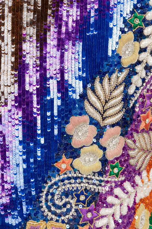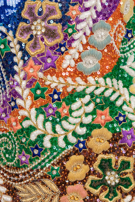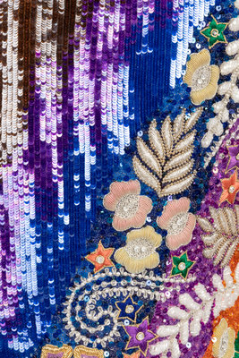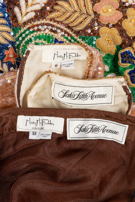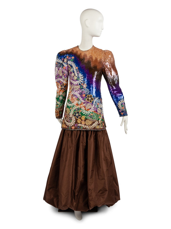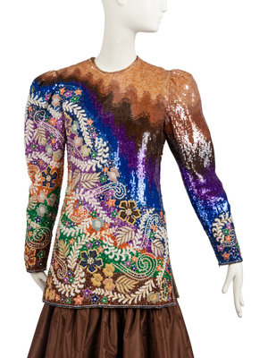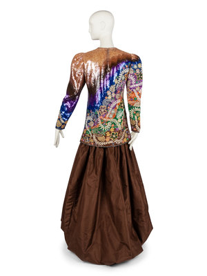Two piece evening ensemble consisting of a heavily sequined and embroidered multicolor top with center back and side zipper and two weights at the hem. The skirt is brown silk with straight silhouette that becomes fuller at the bottom with an oversized bubble hem.