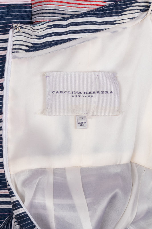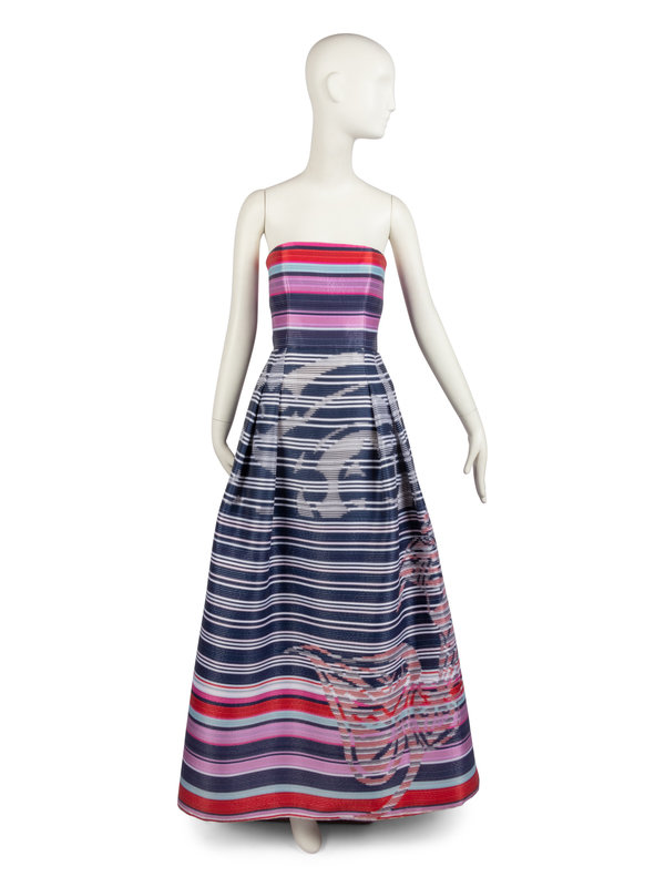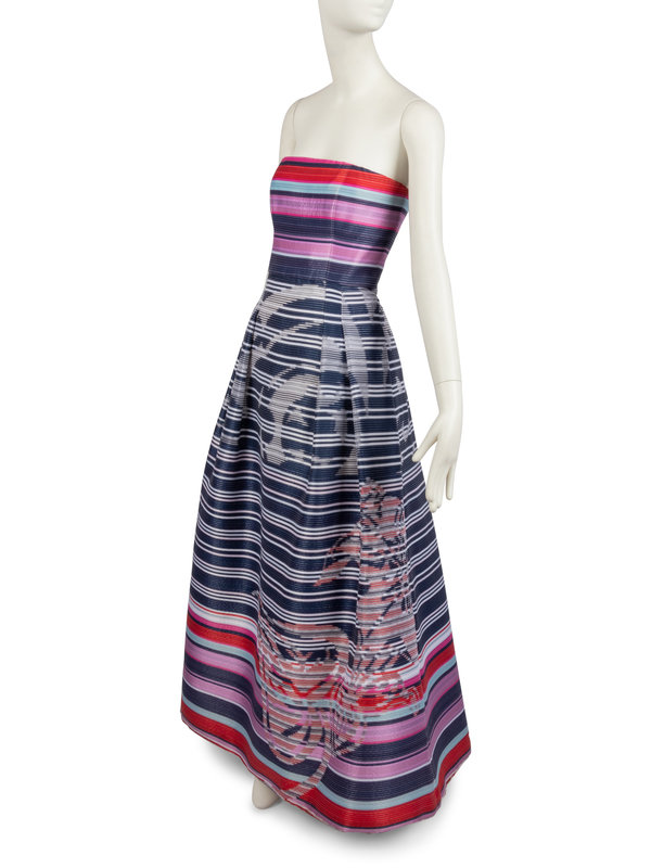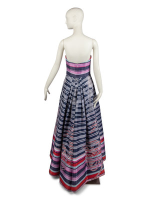 Strapless gown made of multicolored silk organza with voided floral design. Boned corset with center back zipper and pleated waistband.