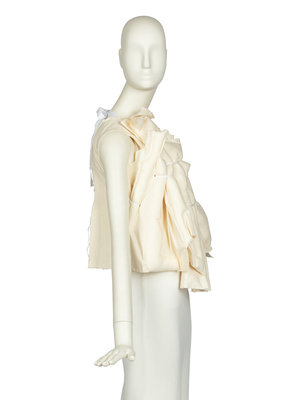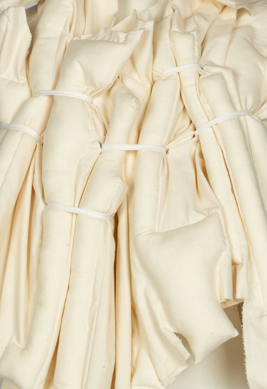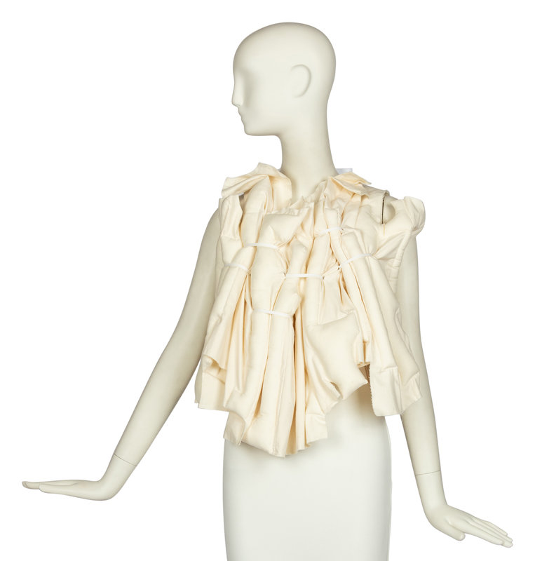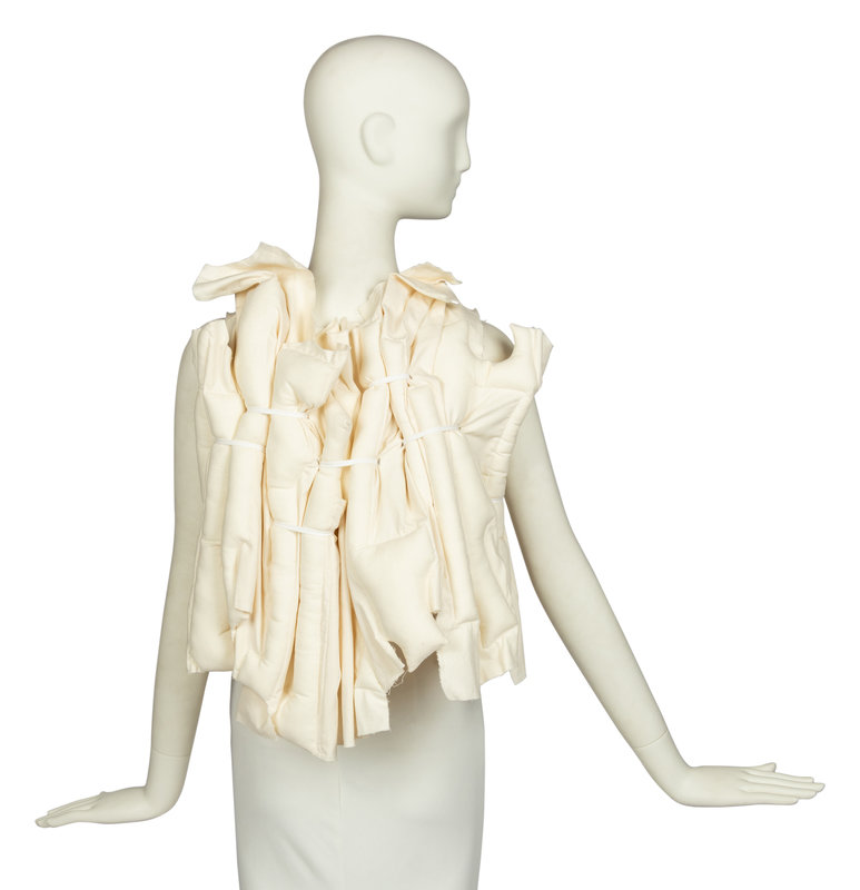 Short-sleeved, backless top with tie closure at back. Constructed of rectangular stuffed tubes strapped together with cotton ribbon. S/S 2013 "Crush" Collection, inspired by Fukushima tsunami wreckage. The piece retains its orginal retail tags and extra fabric swatch.
