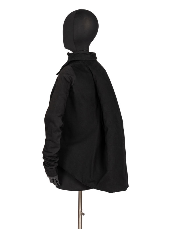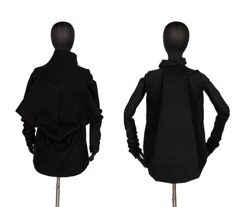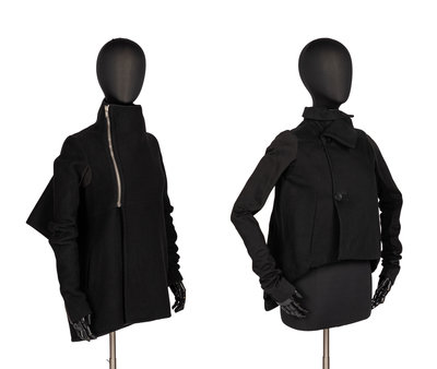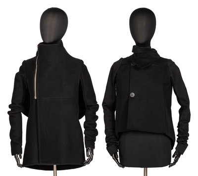 Black cashmere and wool jacket with high collar, silver-tone zipper at the side, long set-in sleeves with a black ribbed knit panel and back folded over cape.