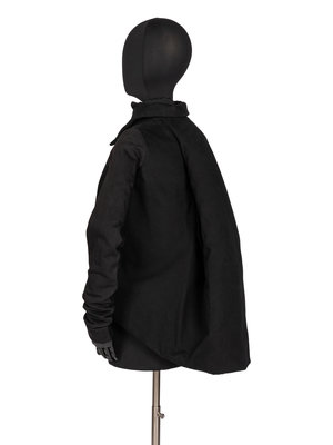 Black cotton blend jacket with oversized collar, single off center button padded in the chest, extra long sleeves with ribbed panel, lined in brown and grey silk.
