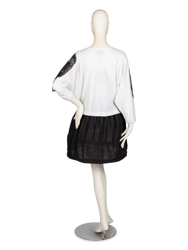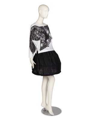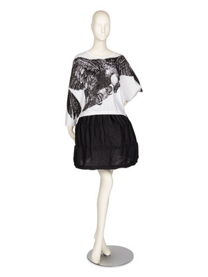 White cotton shirt with crew neckline and batwing sleeves with black bird printed on the front.