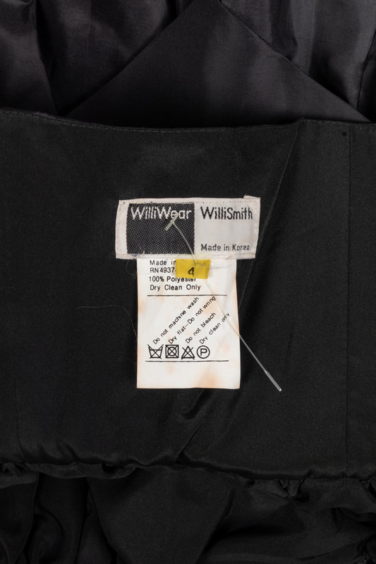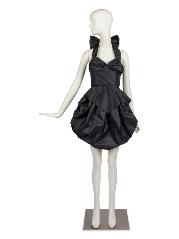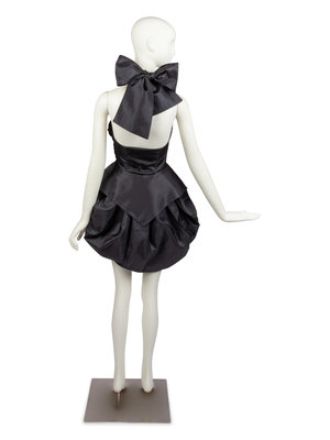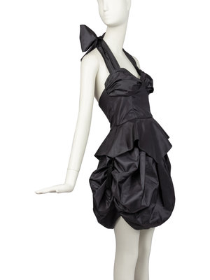 Grey taffeta dress with tie at the neck, sweat heart neckline with extra fabric at the cups to accentuate the breasts, pointed apron front and tassels on either side, and gathered bubble hem underneath.