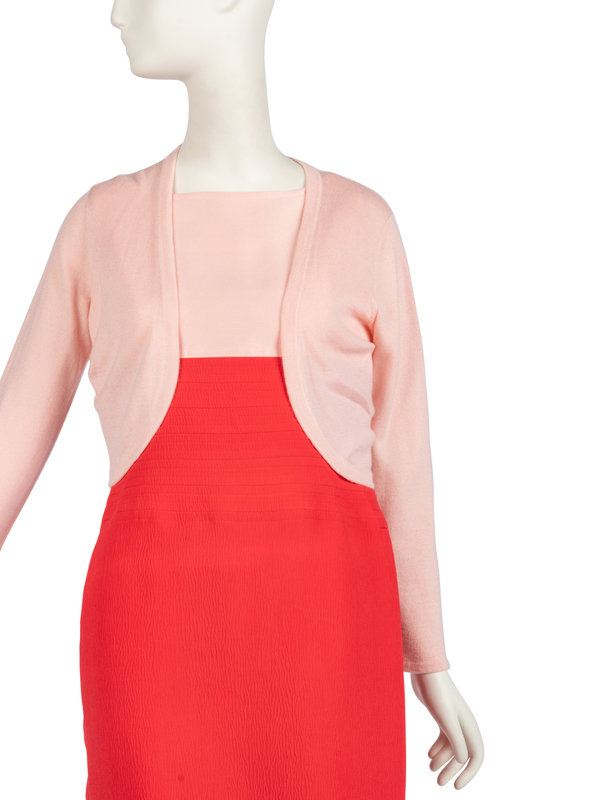 Pink and red sleeveless cotton and silk dress, center back zipper. The dress reatains its Saks Fifth Avenue tags with a listed price of $1,990. The cardigan is a cashmere / silk blend and retains the retail tags with a listed price of $1,050.