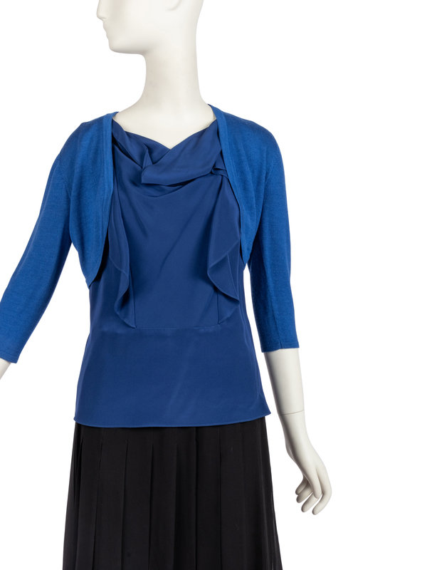 Blue 100% silk sleeveless blouse with ruffled front and side zipper. The blouse has the retail tags with a price of $890, the silk / cashmere blend cardigan has the same with the same price.