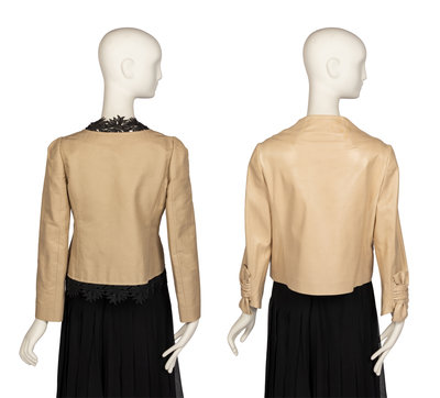 Light tan lamb leather jacket with a crew neckline, long sleeves with a gathered bow cuff, two front pockets, and center front snap closure. The jacket is lined with gold-tone silk satin.