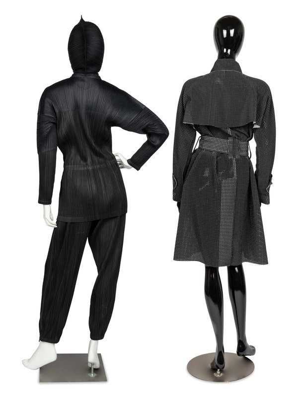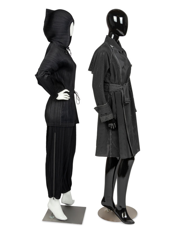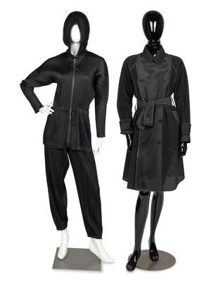 Black pleated polyster top and pants. The top is made with a hood, long sleeves, see-through pockets over each hip, and center fron zip closure. The pants are made of the same material as the top and feature a gathered waistband, see-through pockets over the hips, and zipper up each pant leg, which is gathered into the hem.