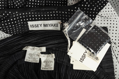 Black polyester fabric with an all-over cut-out dot pattern. The coat is cut with a notched lapel, long sleeves, pocket over each hip, self-fabric belt, and double-breasted button closure. The coat retains the retail labels.
