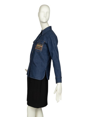 Blue denim shirt with snap button front, two patch pockets one with brown, red, and green horse bit emblem that reads "Gucci Boutique". The shirt retains its retail tags from Gucci.