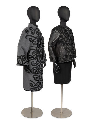 Black lamb leather collarless jacket with zippered from, long set-in sleeves, textured swirl design on the front and trimmed with the same design, the swirl design is made from self black leather and silk cord.
