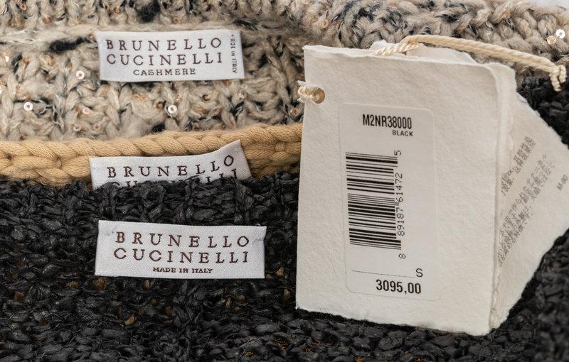 Grey and black knit cropped cashmere and silk sweater with mini sequins throughout, cropped sleeves.