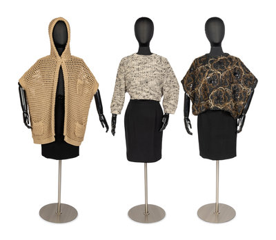 Tan knotted sweater with cap sleeves, three knitted pockets and hood, single snap closure under the neck.