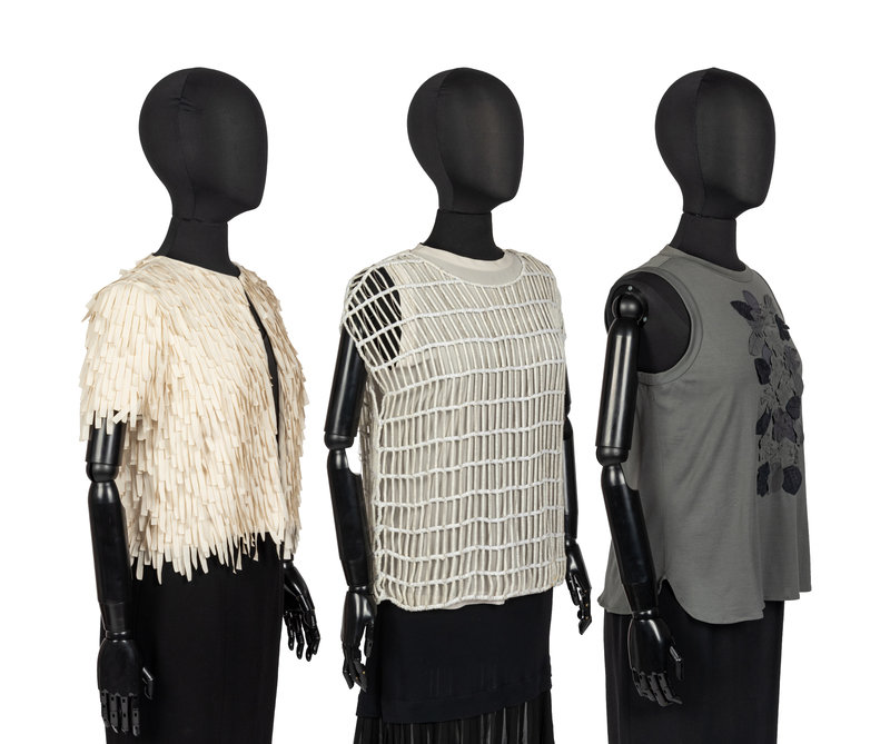 Grey 100% cotton sleeveless top with crew neckline and center back button. Grey and black cut floral pieces at the front attached with matching thread.