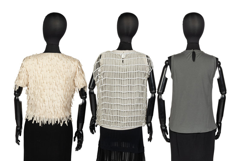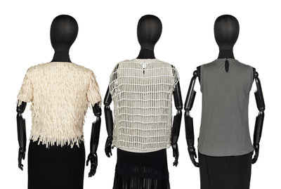 Grey silk blend open knit top with chain detail, detachable grey shell, crew neckline and cap sleeve.