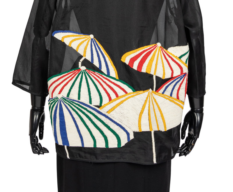 Black organza fabric jacket with primary color umbrella embroidery design, open front with no closure.