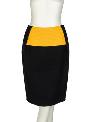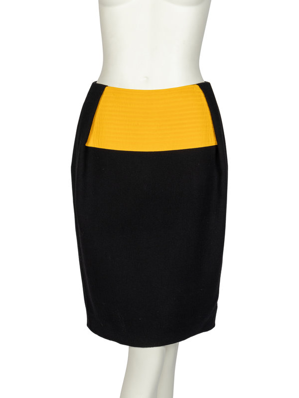 Black wool crepe fabric suit with long sleeves, rounded shoulders lightly padded, center front button entry that is covered, quilted geometric design with red and green silk ribbon ties. The skirt has a quilted yellow center piece and two slash pockets.