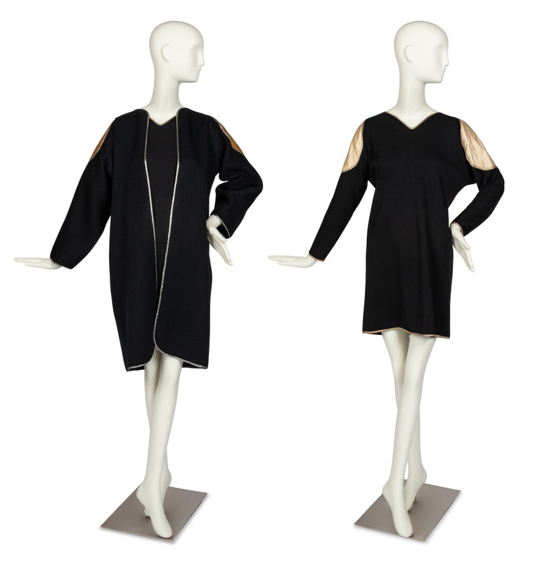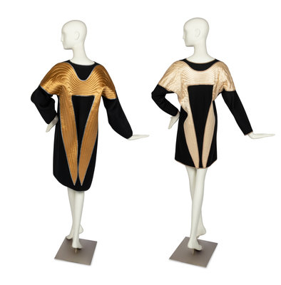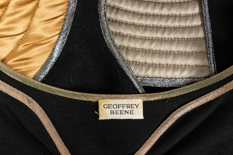 Black wool jersey V neck dress with drop shoulders and long sleeves, trimmed in lurex ribbon, quilted silk swirl design starting at the top of the shoulders running down the back.