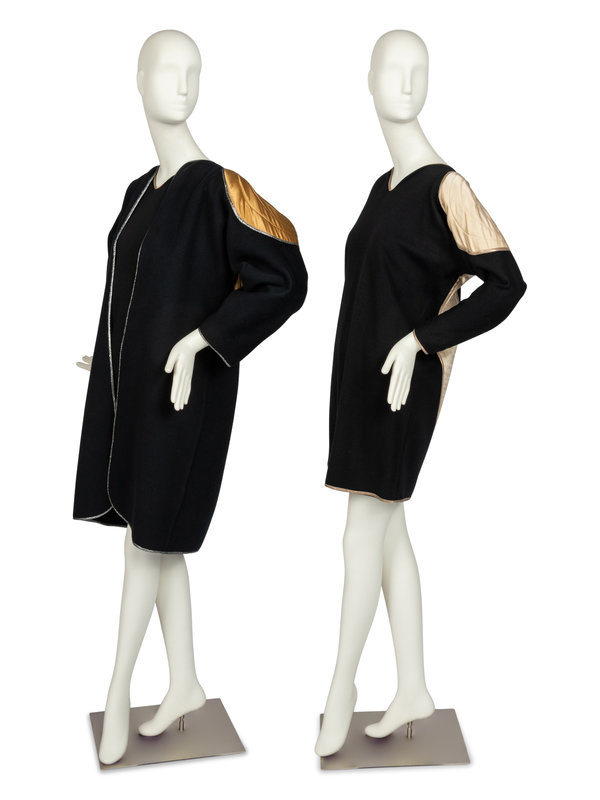 Black wool reversible coat with silver lurex ribbon trim, open front with no closures, swirl gold quilted design that starts at the shoulders and runs down the back. The coat reverses to the same design with a grey quilted silk swirl trimmed in silver lurex ribbon.