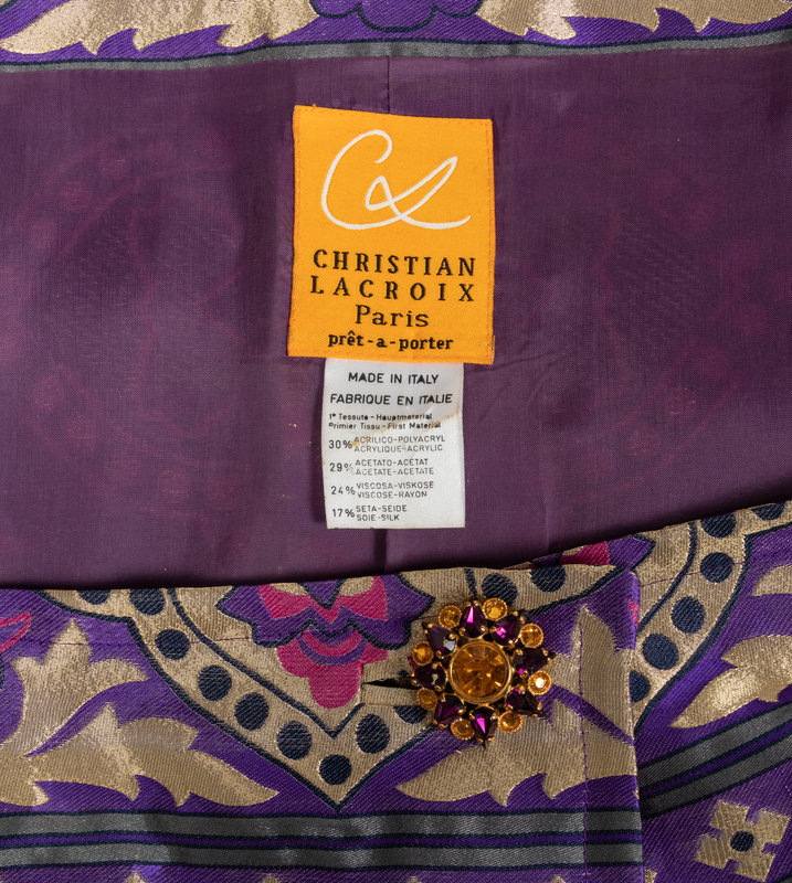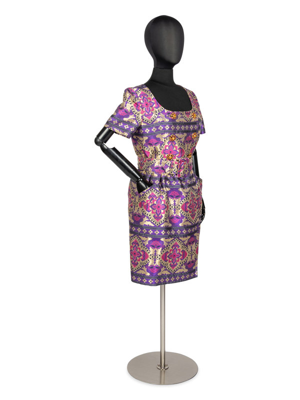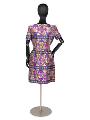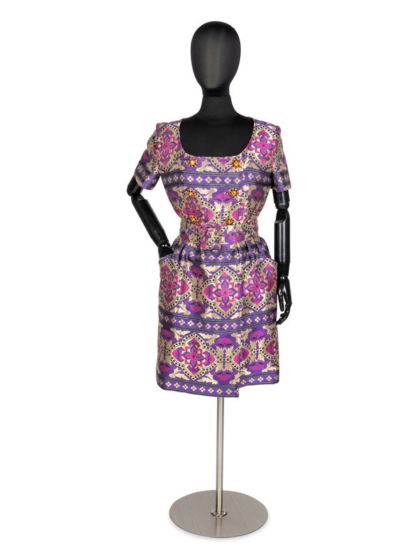 Purple and gold dress with a square neckline, short sleeves, gathered waistline, and a double-breasted rhinestone double breasted closure. The dress is finished with a self-fabric belt and covered buckle.