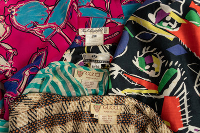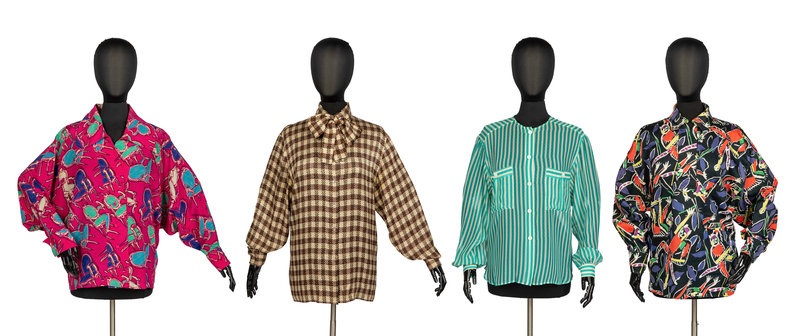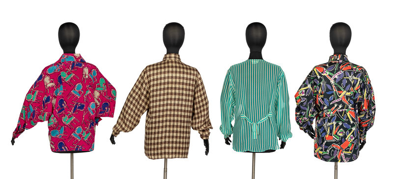 Pink silk shirt printed with multi-colored chairs. The shirt is cut with a fold down lapel, long and wide sleeves with a French cuff and triangle-shaped blue cuff links, front pockets, and center front button closure.