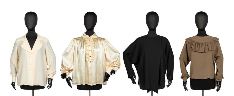 Cream 100% silk top with notched lapel, long sleeves and single button pleated cuff, four button closure at the center front.