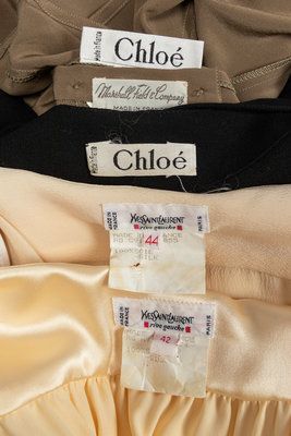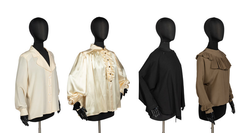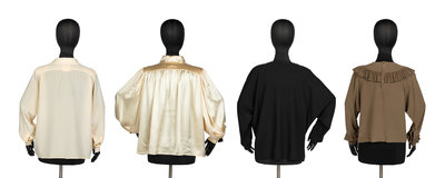 Tan silk shirt trimmed with pleated self-fabric trim. The shirt is cut with a crew neckline, long sleeves, and a pullover design with three button closures at the back.