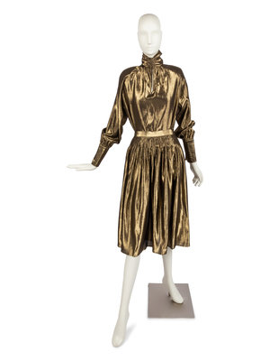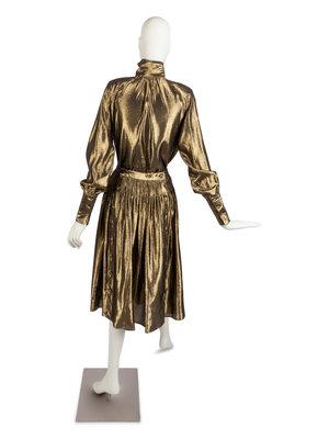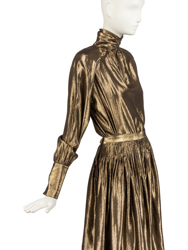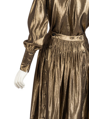 Gold lamé ensemble consisting of a blouse with a high neck, three button barrel cuff and matching skirt, pleated beneath the waistband, functioning buttons down the back with a flap that fully opens.