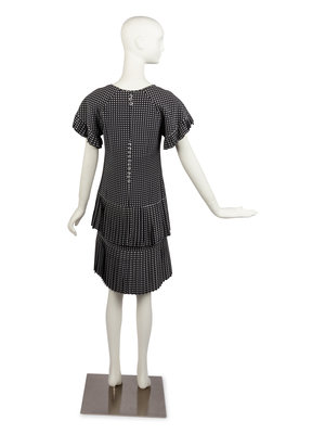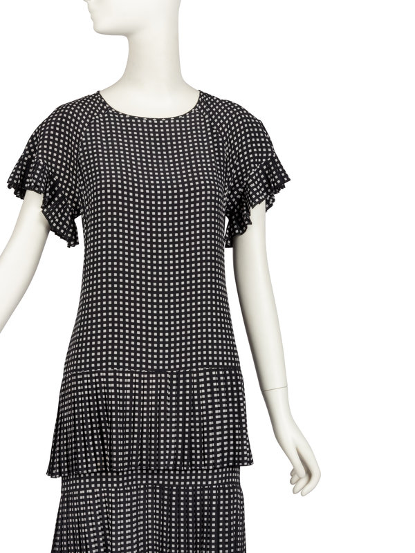 Blue silk dress printed with white squares and cut with a wide scoop neckline, raglan sleeves, and embellished with pleated self fabric at the sleeve and dress hem. The dress closes at the center back neckline with clear plastic square buttons.