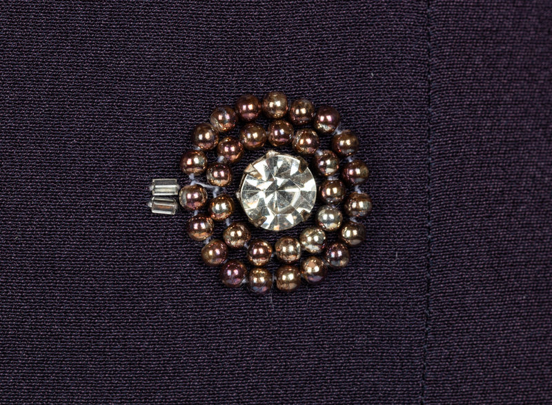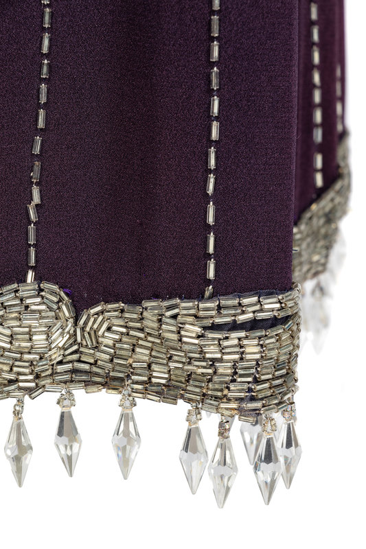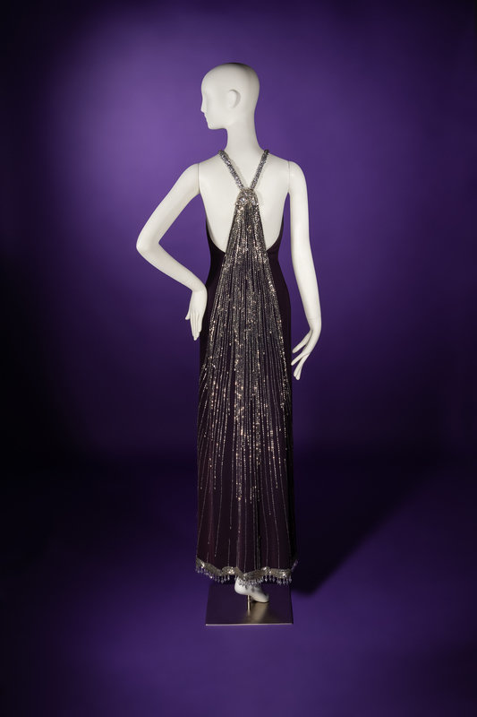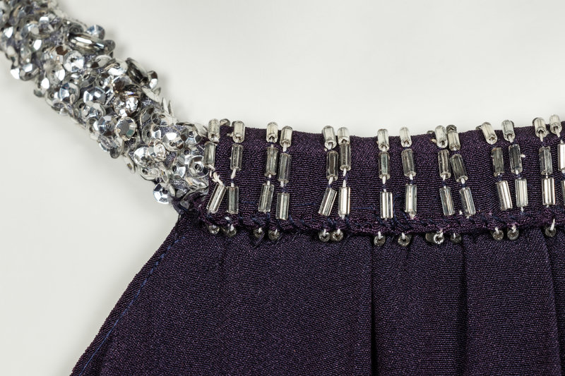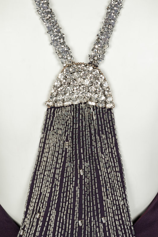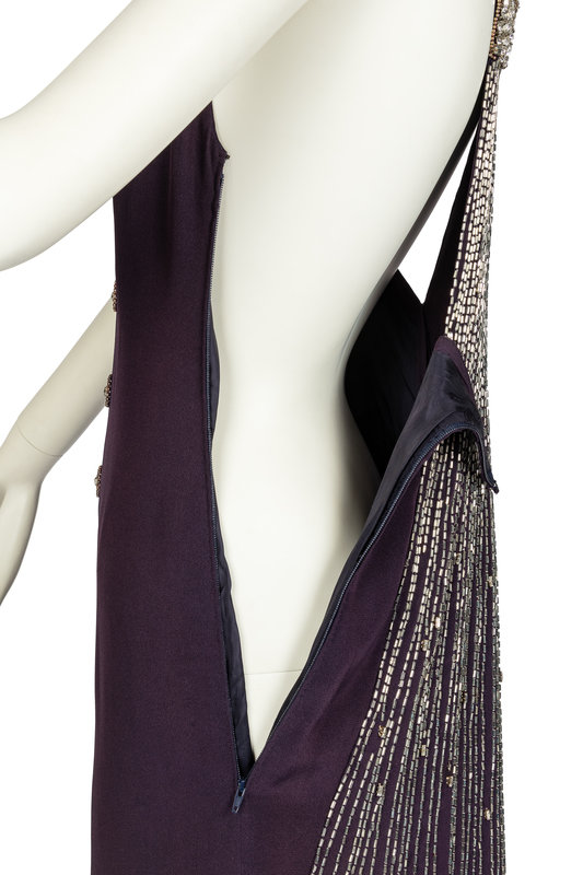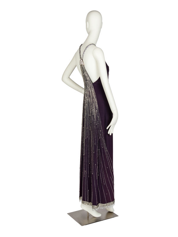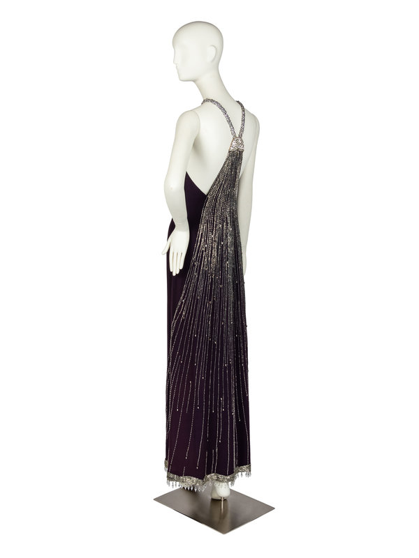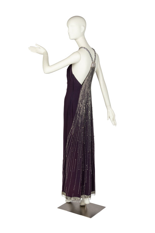 Evening dress of purple acetate/rayon blend, trimmed with rhinestones, glass beads, and sequins. The dress is cut with a halter neckline, fitted body, and long flared hem. The dress closes with a hook and eye at the base of the right back shoulder strap and side zipper.