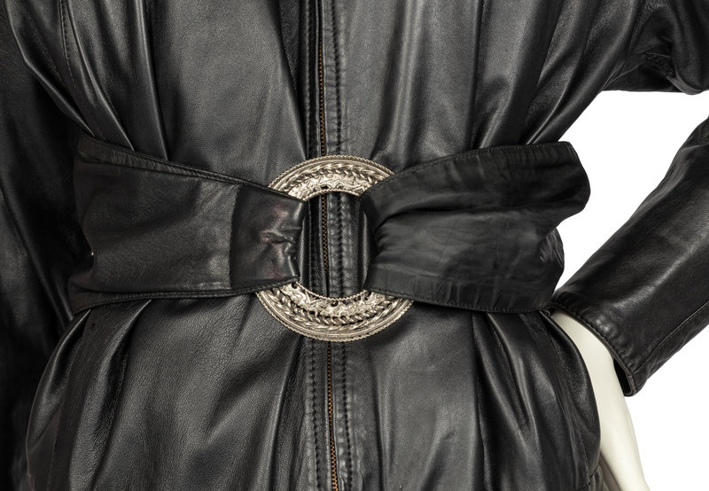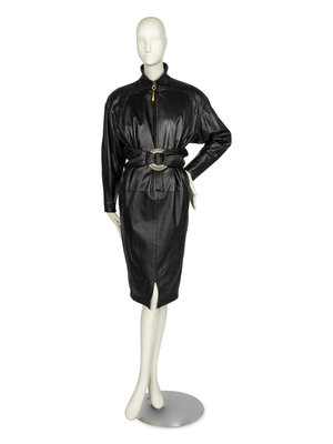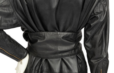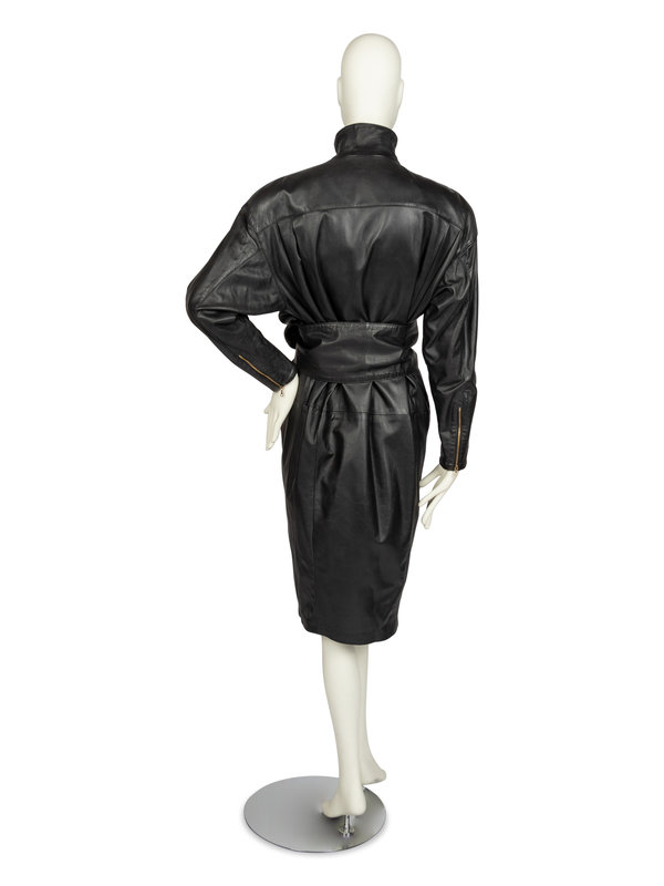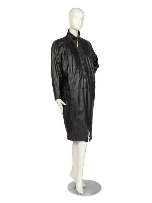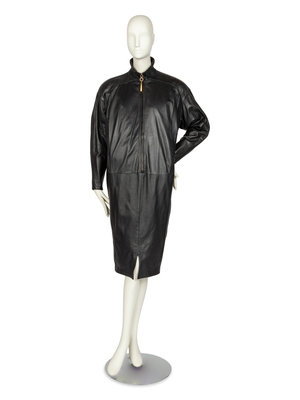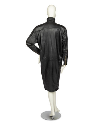 Oversized black leather dress that tapers to the hem. The dress is cut with a stand collar, long sleeves, and a center front zipper closure with a gold-tone metal droplet zipper pull. The fullness of the leather is pleated into the shoulders and narrows towards the hem.