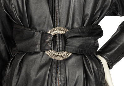 Wide black leather belt with a silver-tone circle buckle.