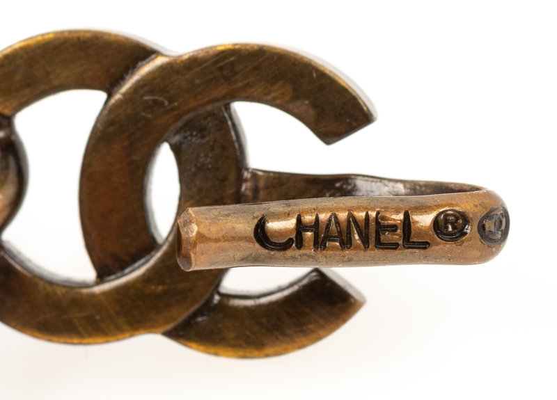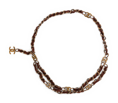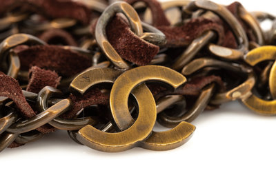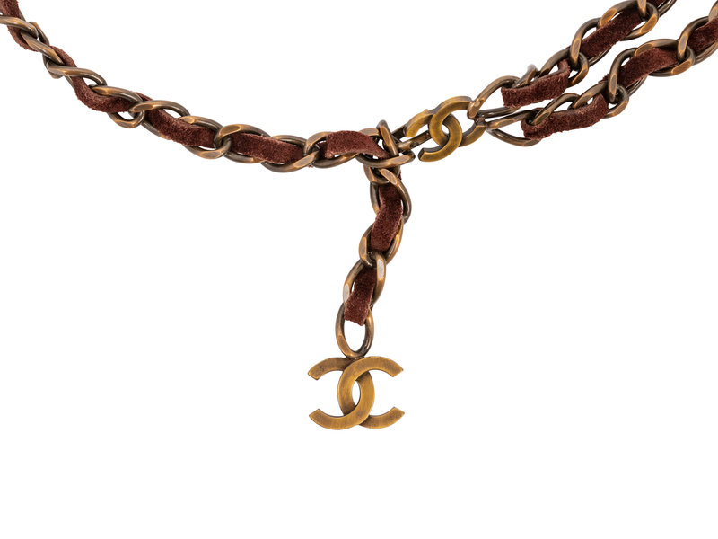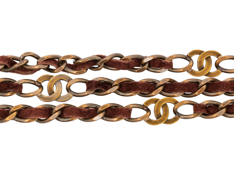 Bronzed gold-tone metal chain with CC logo and woven with brown suede.