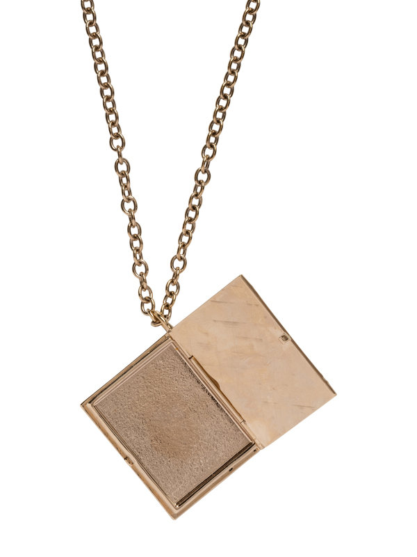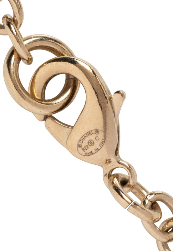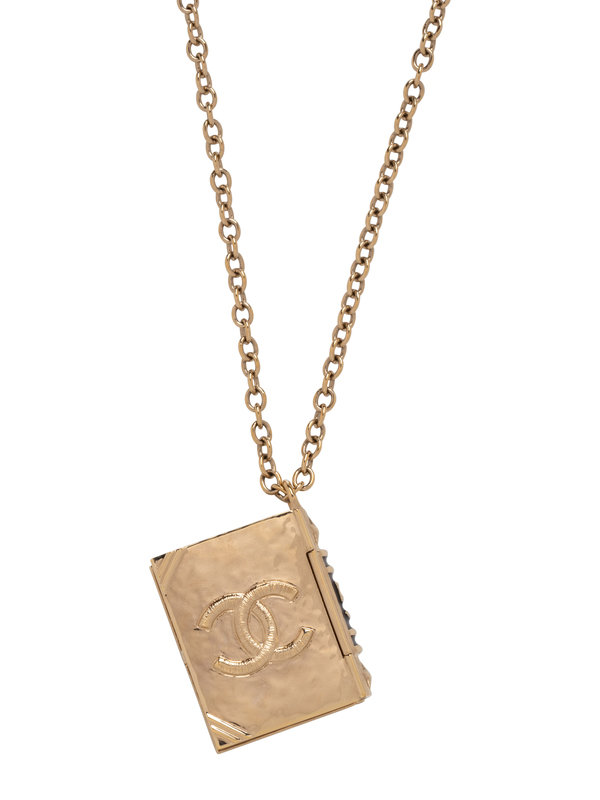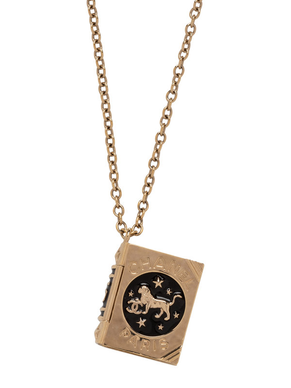 Gold-tone metal locket with "CHANEL PARIS" engraved on the front with a lion, logo and stars and "CC" logo on the reverse. The locket is fully functional and opens with a pressure clasp closure. The gold-tone metal chain is stamped "Chanel"