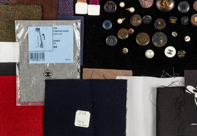 This lot contains 32 Chanel buttons, 30+ Chanel fabric swatches, and 9 Chanel thread samples.