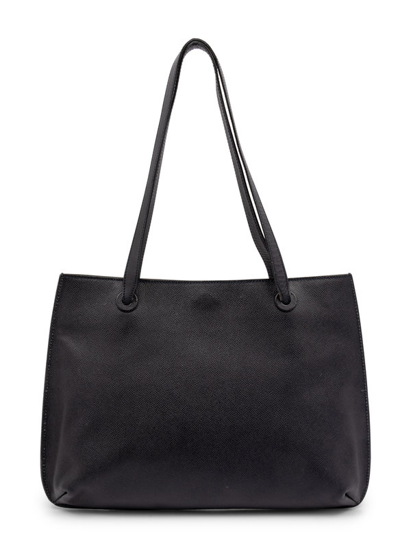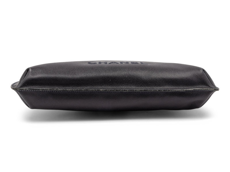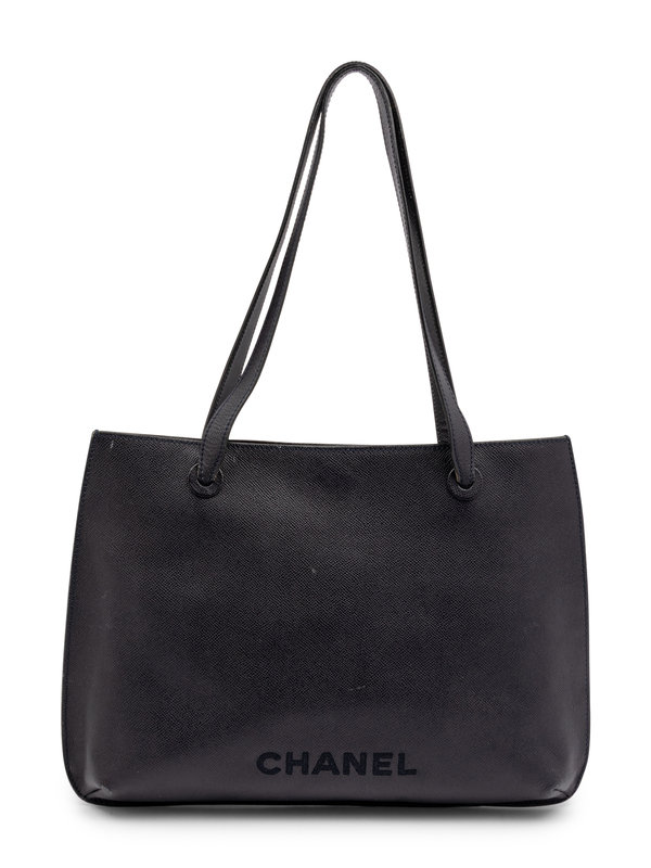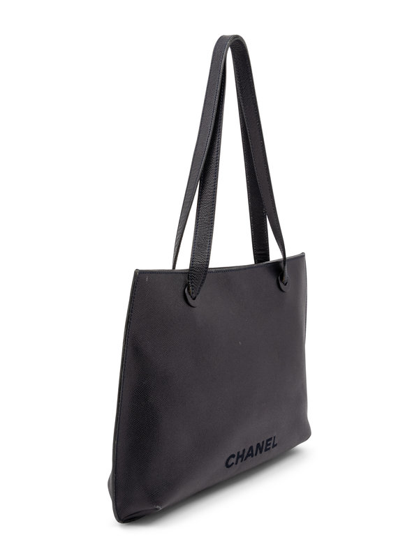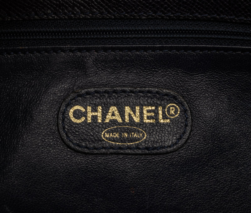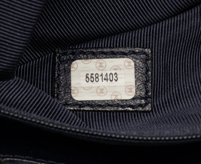 Very dark blue leather shoulder bag with "CHANEL" embroidered on the front in black thread.