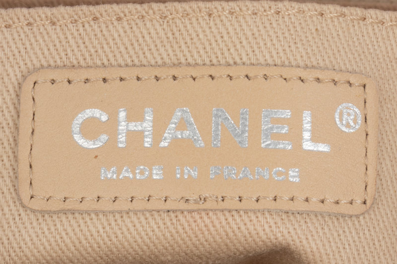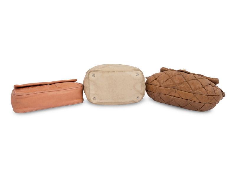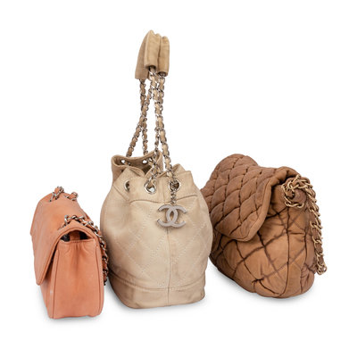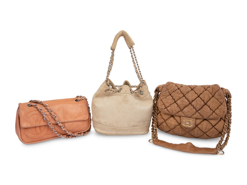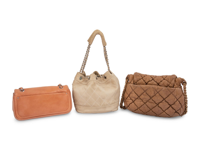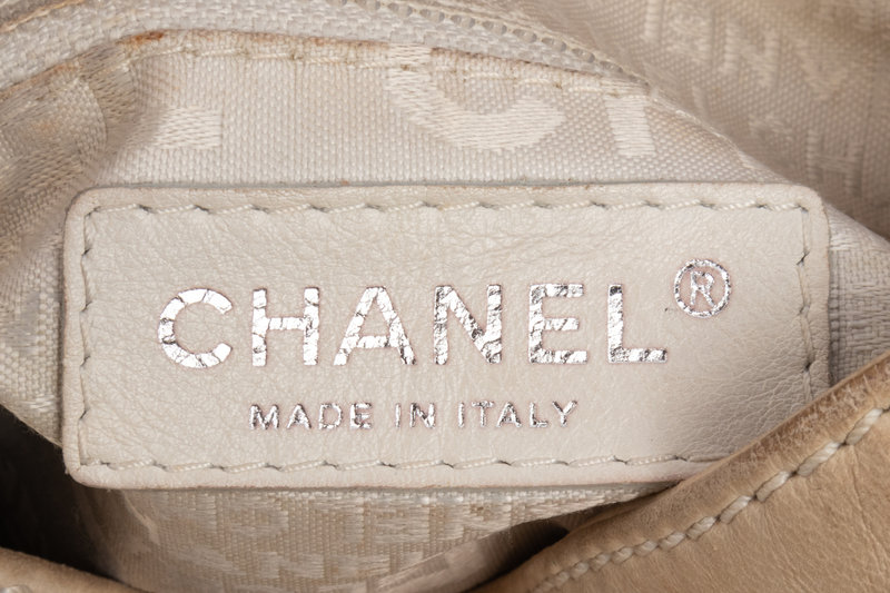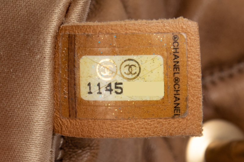Light tan leather quilted bag bucket bag with silver-tone chain strap woven with leather and drawstring closure.