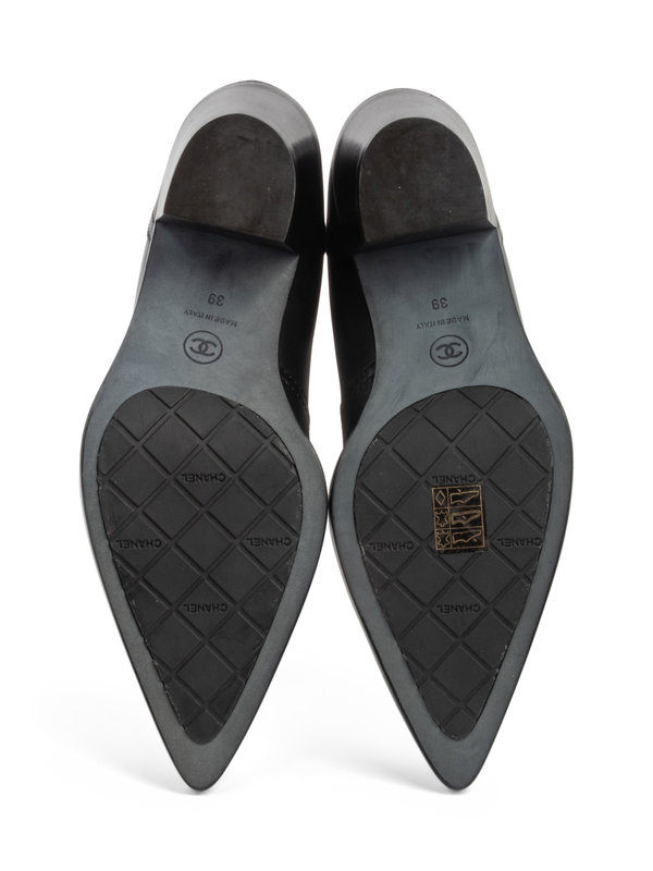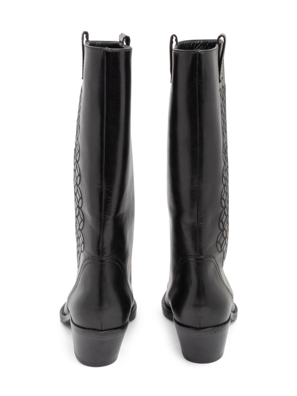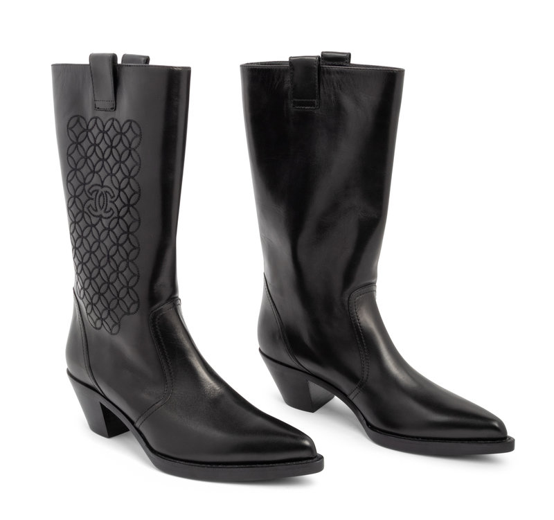 Unworn black leather cowboy boot with "CC" motif and quilted design.