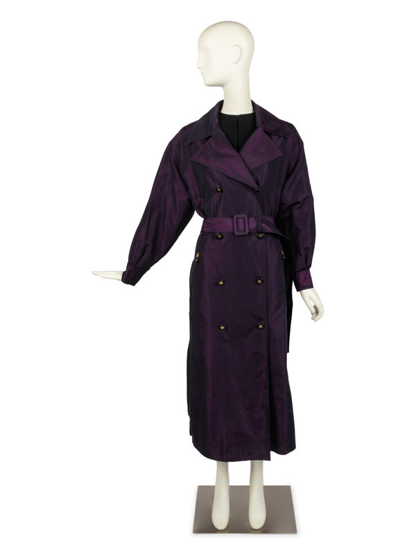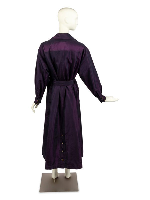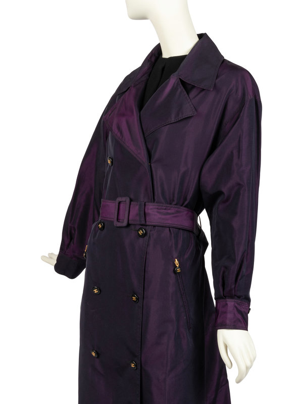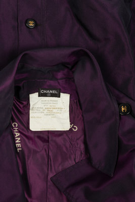 Purple and black iridescent silk taffeta trench coat with a wide notched lapel, long sleeves with a buttoned cuff, zippered pocket over each hip, and center front double-breasted button closure. The center back hem of the coat features a buttoned pleat with CC logo buttons. The coat comes with a self-fabric buckled belt and is lined with purple silk printed with "CHANEL" in white. The buttons are black with a raised gold-tone CC logo in the center.