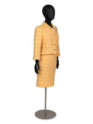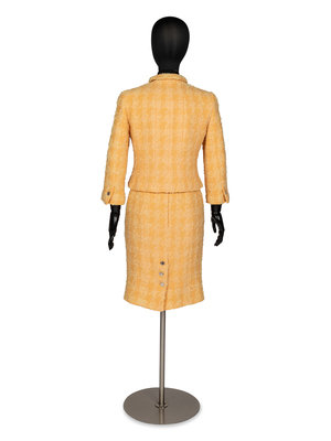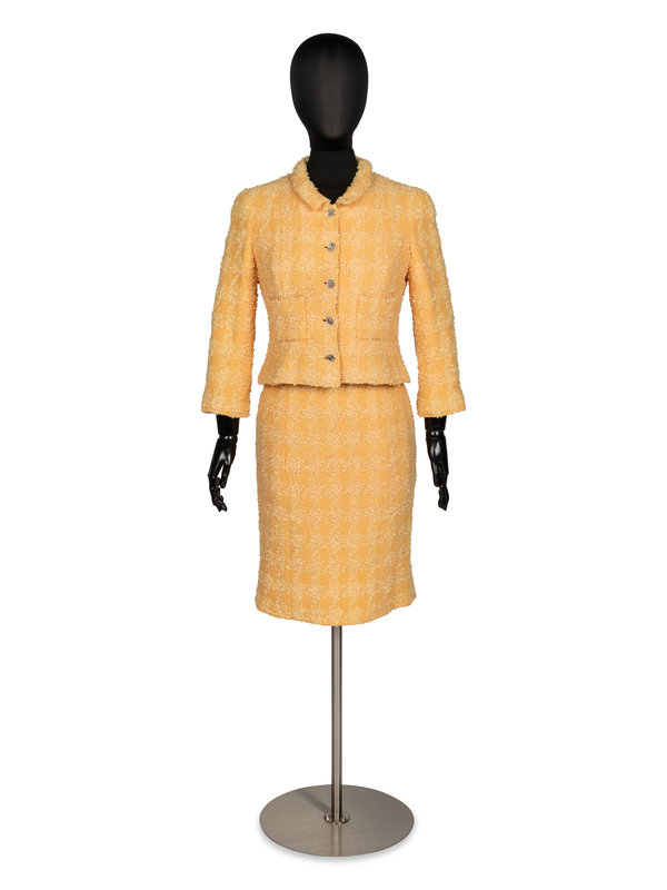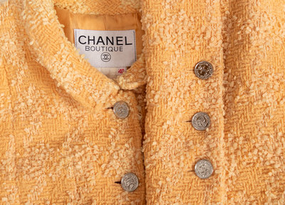 Orange sorbet wool blend jacket with a fold-own collar, long sleeves, two pockets on the front, and a center front silver-tone button closure. The buttons alternate in design with one featuring the CC logo and the words "Chanel 31 rue Cambon Paris", while the second features the bust of Coco Chanel and the words "Paris France". The jacket is lined with orange silk woven with the CC logo and finished with a silver-tone chain on the interior hem. The skirt is cut without a waistband and closes down the center back with a zip. The skirt is lined with the same silk as the jacket and the center back hem features a kick-pleat that is finished with three silver-tone buttons.