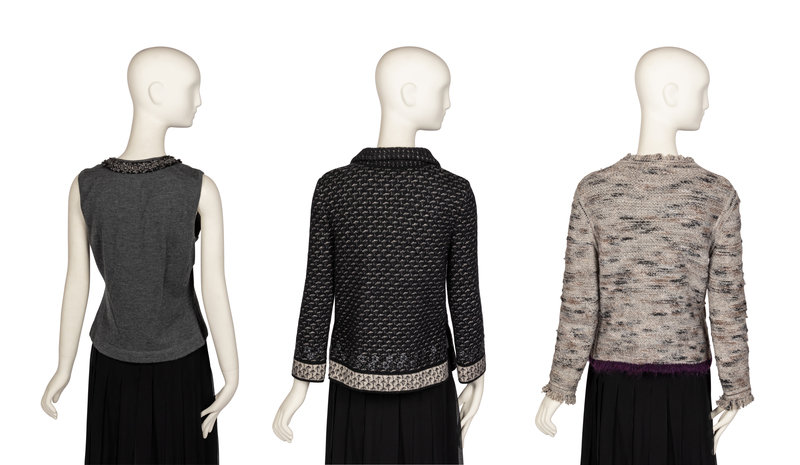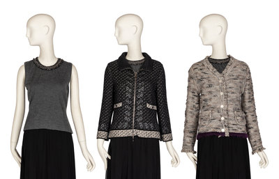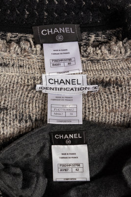 Grey and brown wool blend knit cardigan with a v-neckline, long sleeves, two pockets on the front, and a center front button closure. The hem of the jacket is finished with a strip of purple knit. The silver-tone buttons are circular and feature the name "CHANEL".