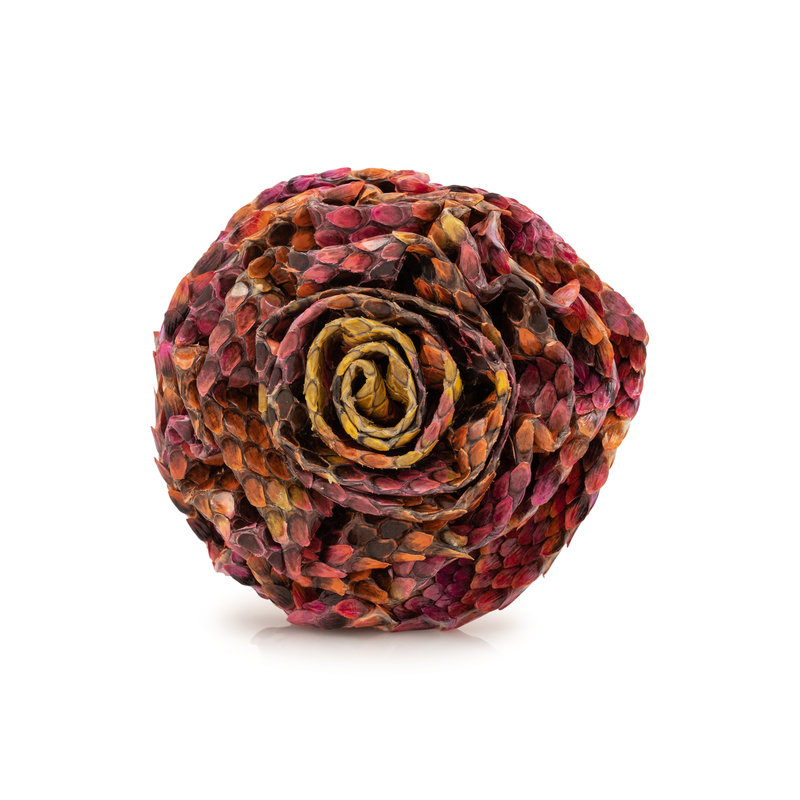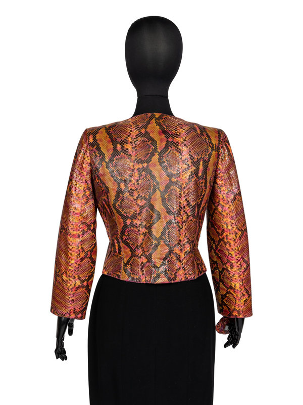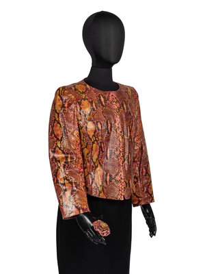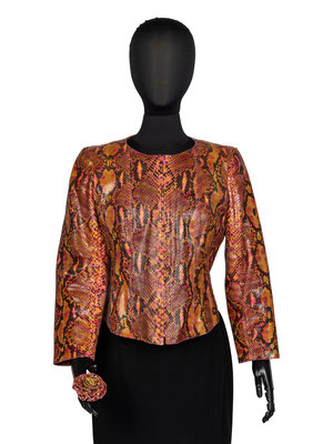 Multi-colored python jacket with crew neckline, long sleeves, and center front zipper closure. The jacket comes with a matching python camellia pin that is detachable.